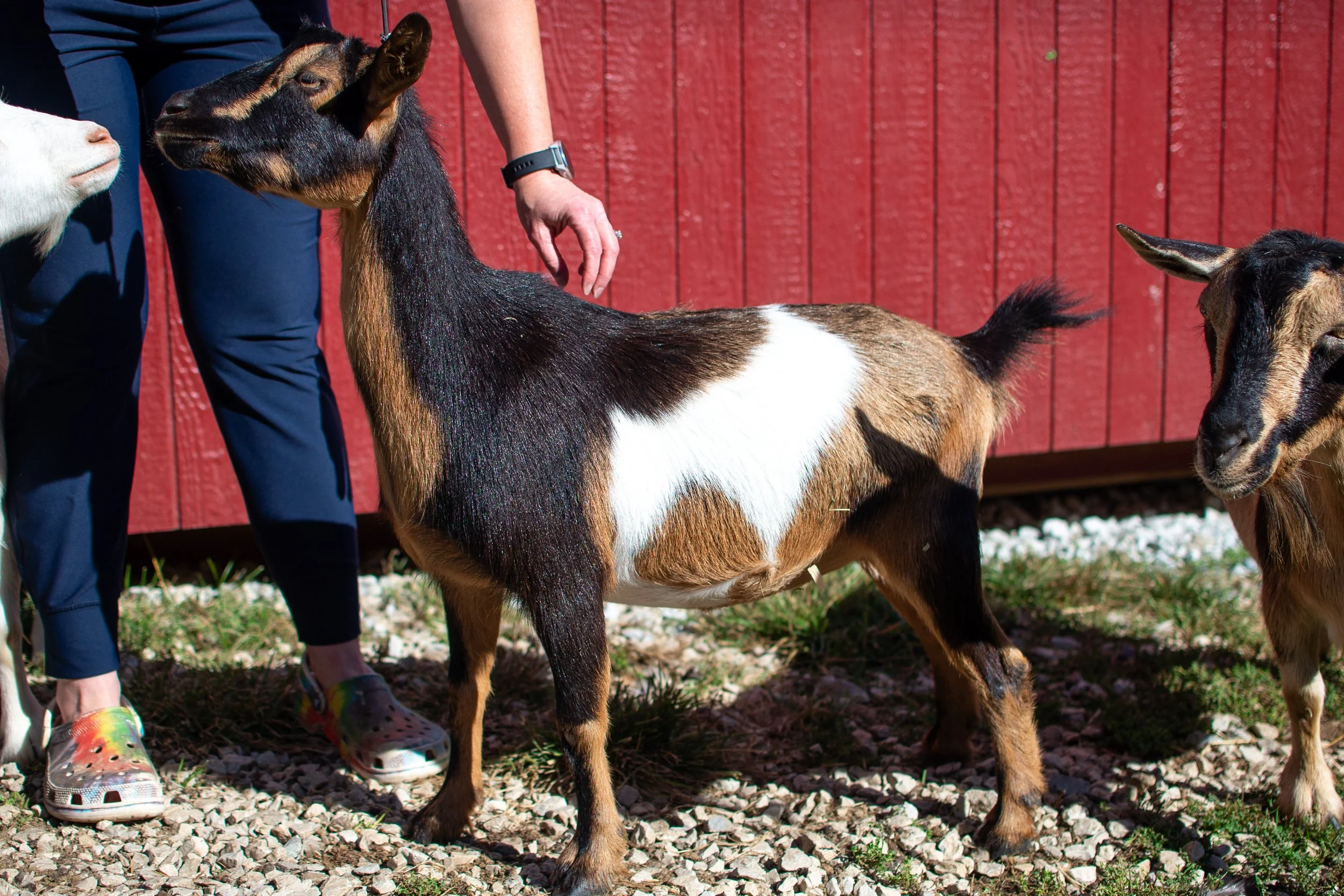 Inky was bred to both Winter and Abraham, 2 days apart, so we will not know until the kids get here. If bred to Abraham, kids will be black or chamoisee. If bred to Winter, kids will be gold or buckskin. She is due either February 12 or February 14, 2026. She will be an almost 3 year old 2F, having previously kidded a single large doeling. Ultrasound at 45 days showed 3-4 kids.